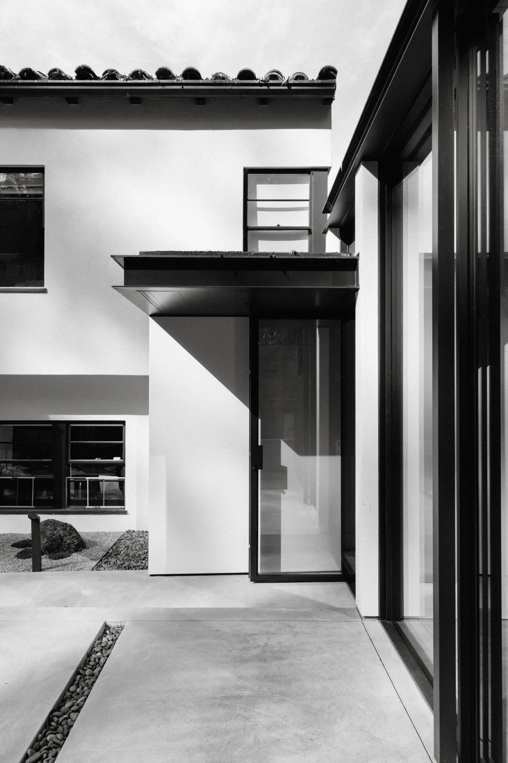 A seamless fusion of historic charm and contemporary minimalism—where a Neo-Spanish Colonial main house gracefully meets a Zen-like glass addition.